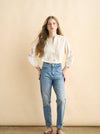The Jo blouse gives all the feminine, delicate feels. Crafted in the softest organic cotton voile and viscose, this victorian inspired blouse features round collar and puffed sleeves with delicate embroideries. This top has inserted lace extend down the bodice and sleeves and delicate pintucks. A line of mother pearl buttons run down the front. A beautiful blouse to dress up, or pair with jeans for effortless style.