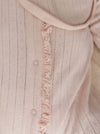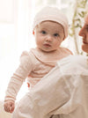 The sweetest little three piece set for a new baby girl. Made from a soft pointelle organic cotton, this footed jumpsuit has a pretty little ruffle detail, snap closure, a knot top hat, and cute little drool bib. Makes a great gift for a baby shower, or new little one.